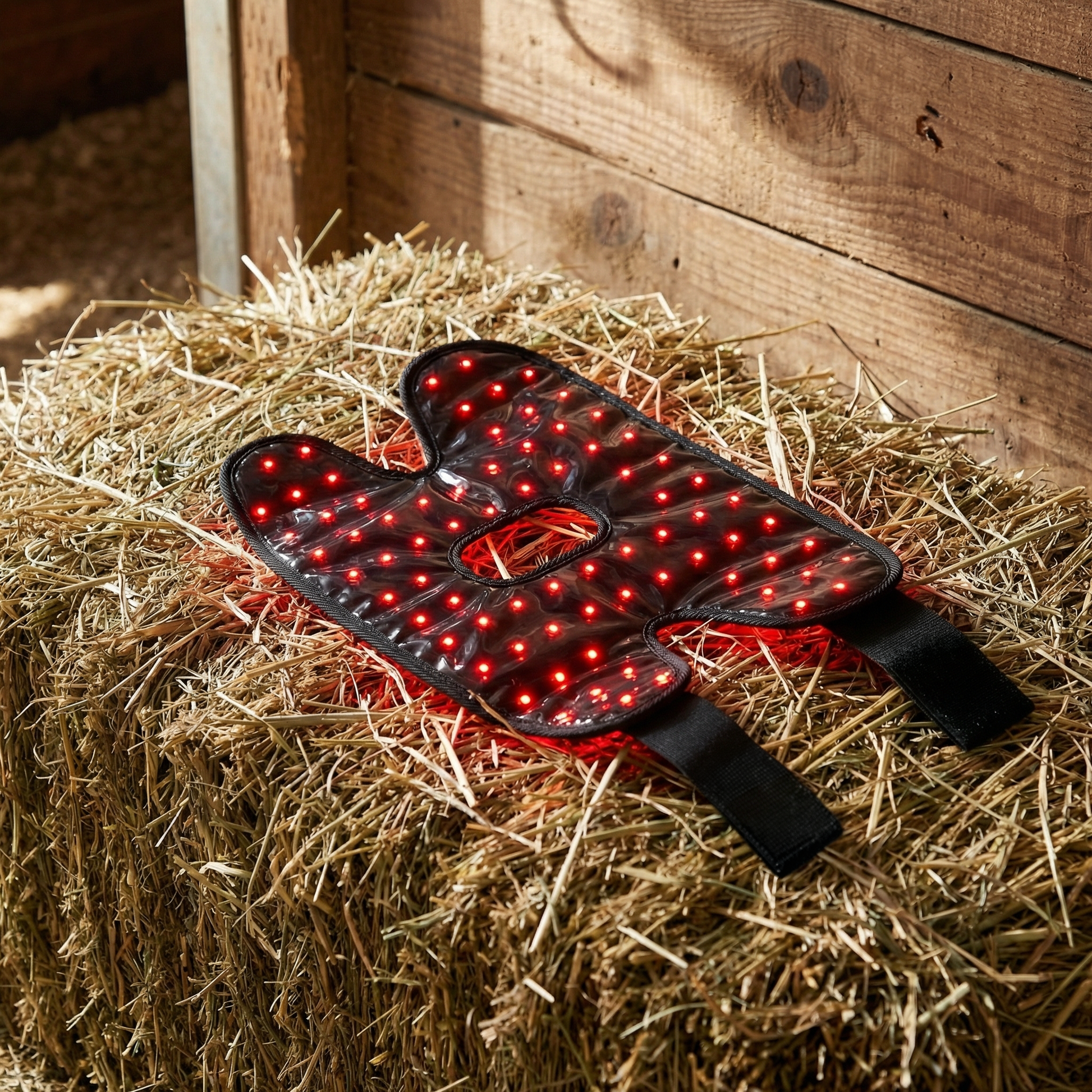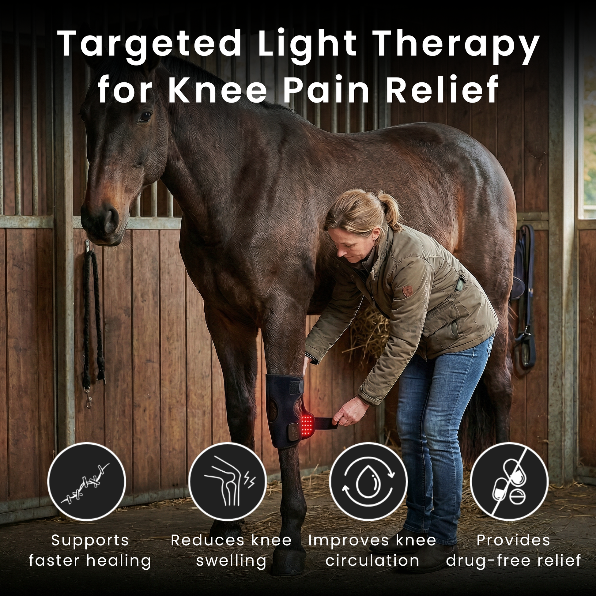 The gentle red-light warmth often helps even nervous horses settle quickly.
